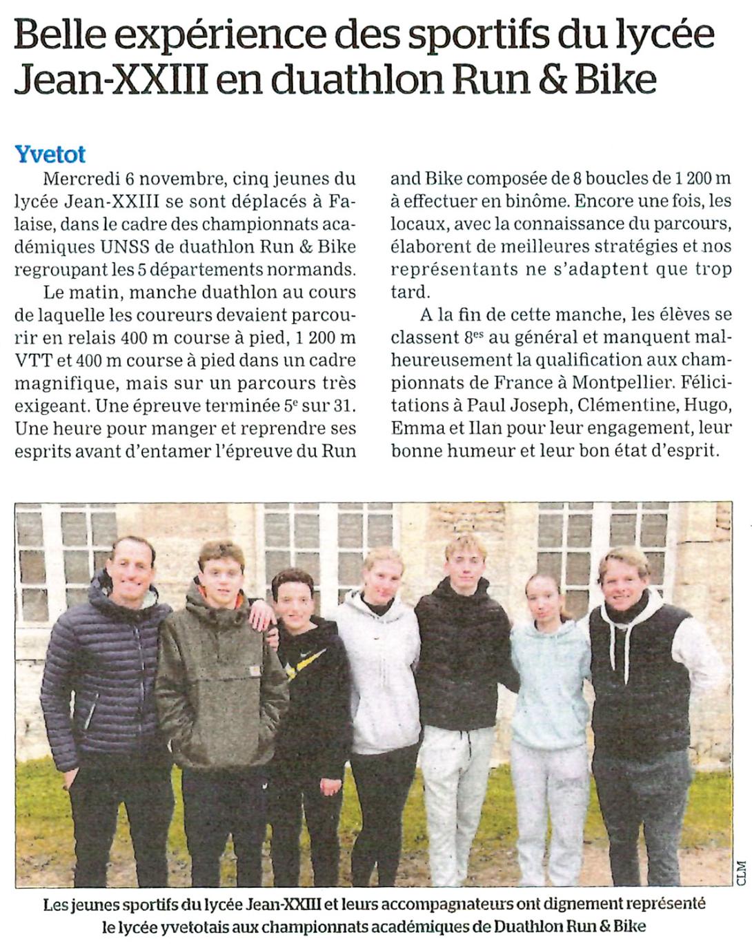 Mercredi 6 novembre, cinq jeunes du lycée Jean-XXIII se sont déplacés à Falaise, dans le cadre des championnats académiques UNSS de duathlon Run & Bike regroupant les 5 départements normands.