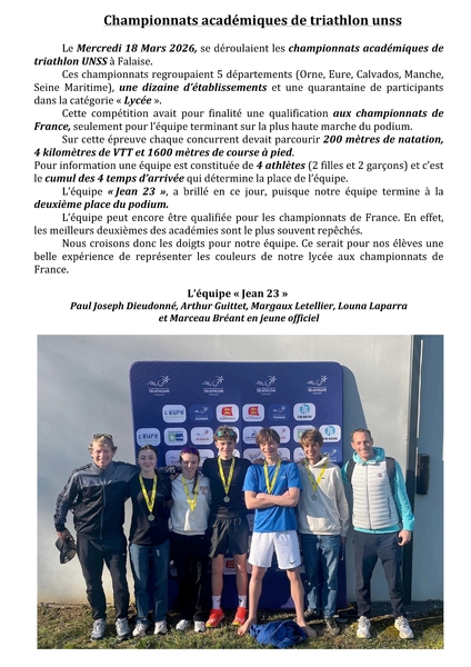 Le mercredi 18 mars 2026, se déroulaient les championnats académiques de triathlon UNSS à Falaise.